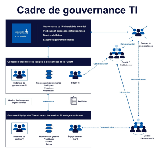 Le concept de « gouvernance TI » à l’Université de Montréal couvre l'ensemble de la structure et des processus par lesquels les participants engagés dans la technologie institutionnelle interagissent, s'influencent mutuellement et communiquent entre eux et avec l'environnement plus large.